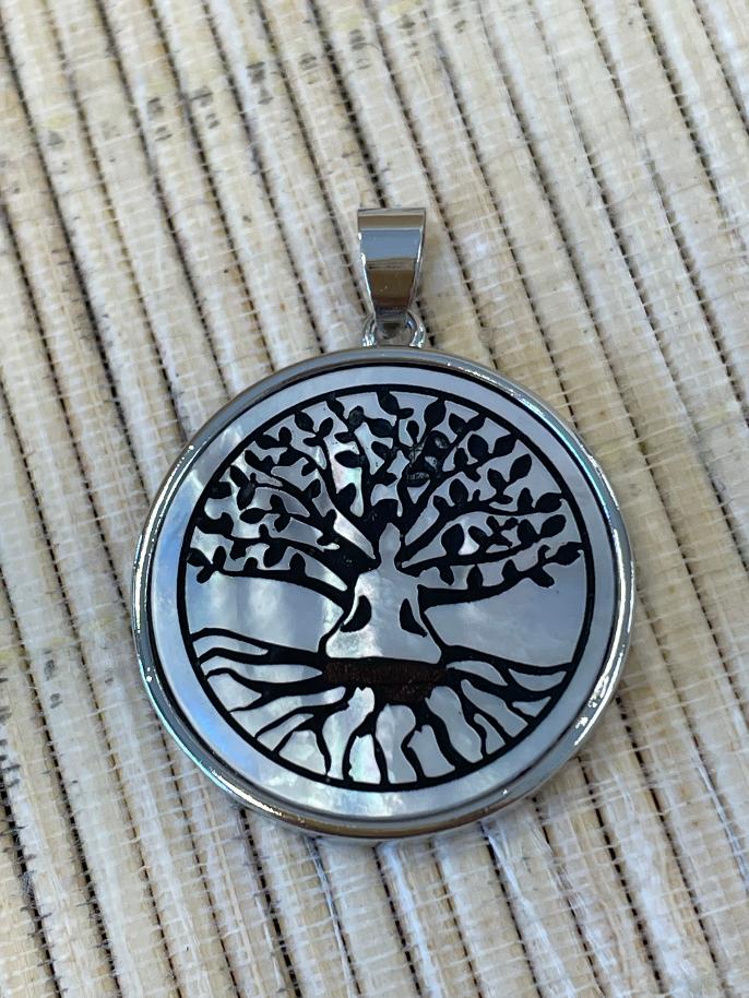 PENDENTIF NACRE ARBRE DE VIE et BOUDDHA EN ACIER25 MM